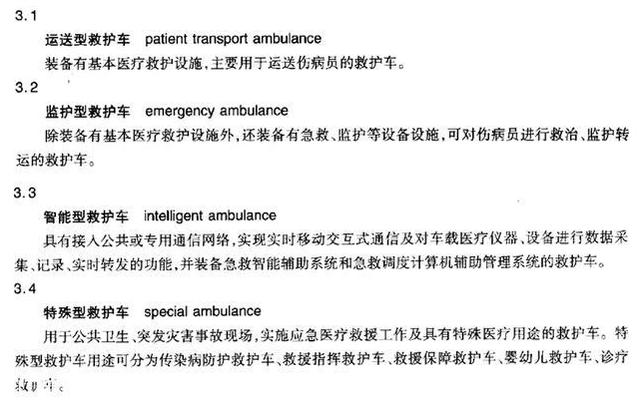 國家質量監督檢驗檢疫總局發布的GB/T 17350-2009《專用汽車和專用掛車術語、代號和編制方法》、工信部2014年3月1日實施的QC/T 457-2013《救護車》、衛生部2008年4月1日實施的WS/T 292-2008《救護車》,都對救護車有著各自的定義。