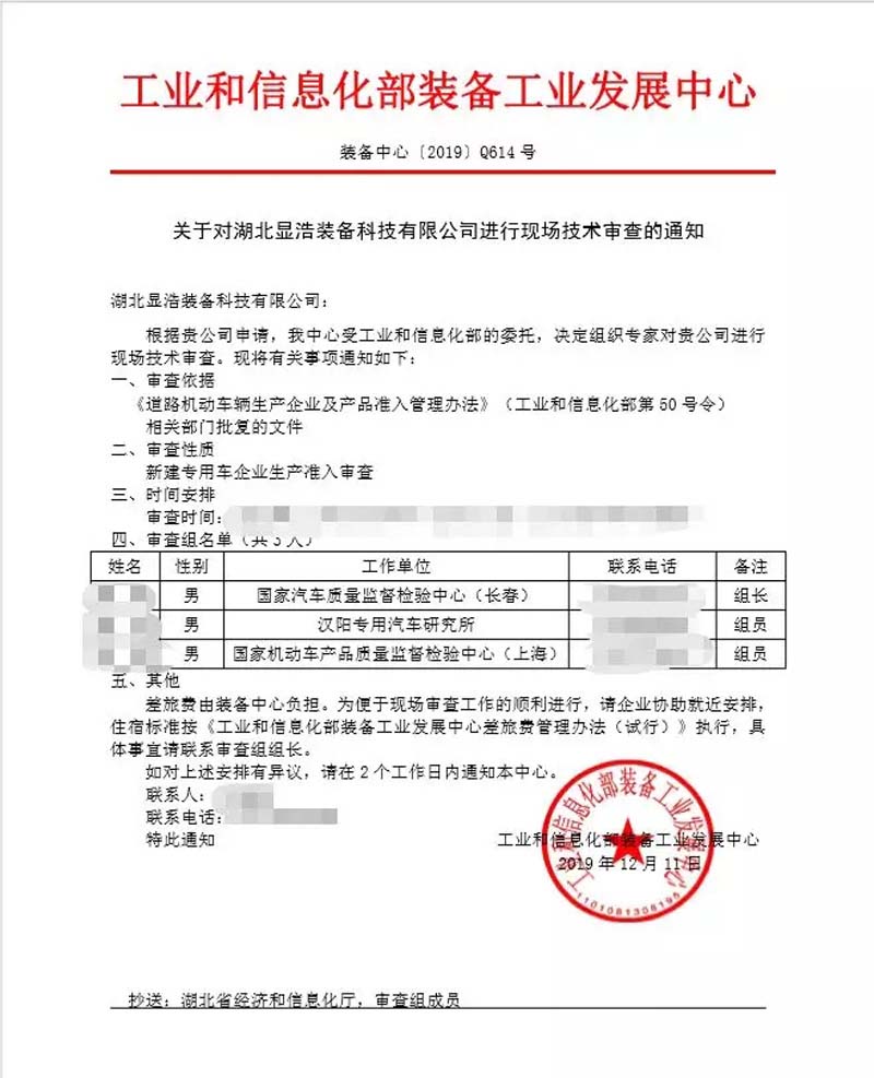 2019年12月19日湖北省顯浩裝備科技有限公司迎來了工信部委派的三位技術審查專家,三位專家對我司申請的醫療車,獻血車,負壓救護車,等專用車企業準入進行現場技術審查。