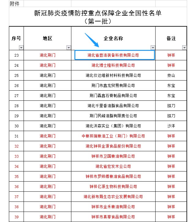 湖北省顯浩裝備科技有限公司被省經濟和信息化廳列入新冠肺炎疫情防控全國重點保障企業(第一批)名單。